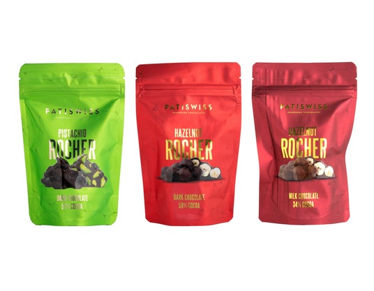 「パティスイス」は、2004年創業のトルコのチョコレートメーカー。スイス人のチョコレート専門家の指導の下、チョコレートを製造しています。「ロシェ」とは、フランス語で「岩」や「岩山」を意味し、ごつごつとした岩のような形をしている点が特長で、ごろごろとしたナッツをまるごとチョコレートで固めています。チョコレートとナッツがおよそ1:1の配合率で作られているため、ナッツのごろごろ感とチョコレートの香りを楽しみながら、それぞれの相性の良い味わいを存分にご堪能いただくことができます。ナッツは、香りの高さと豊かな風味が特長のものを使用しています。