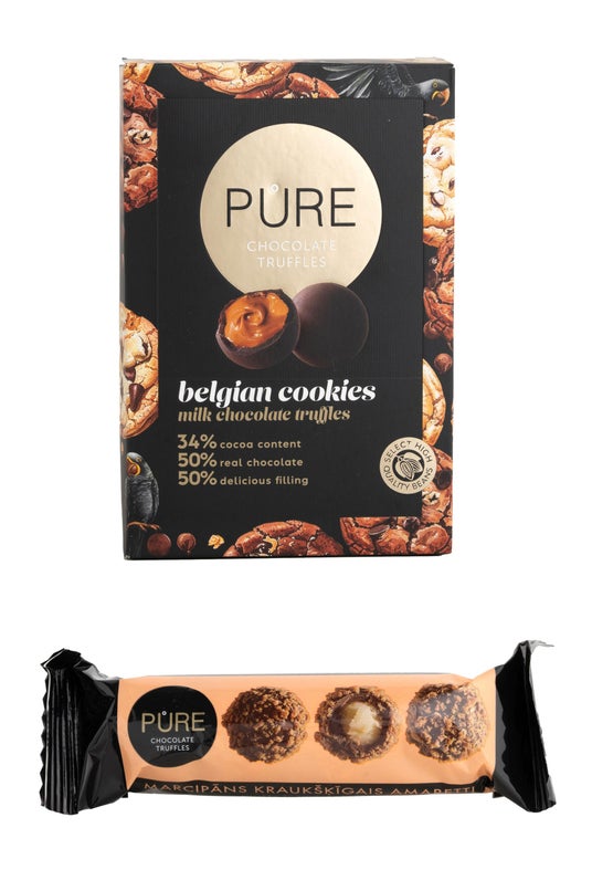 「ピュア」はラトビアのチョコレートメーカーで、見た目も華やかな様々なフレーバーのトリュフチョコレートを展開しています。長らく同社のトリュフを取り扱ってきた中で、今季は新商品4品を発売いたします。ベルギーのカラメルビスケットを思わせるクリームが中心に入り、周りをミルクチョコレートで包んだ「ベルジャンクッキークリーム」や、表面のカリカリとしたクランチと中心に入っているナッツクリーム、そして甘さ控えめのチョコレートとのバランスが良い「マジパンクリーム」など、本格的でバラエティに富んだ味わいをお楽しみいただけるラインアップです。4粒入りの規格は、食べ比べをしていただくのにもぴったりです。華やかなパッケージのため、プチギフトにもおすすめです。4粒入りの規格は、食べ比べをしていただくのにもぴったりです。華やかなパッケージのため、プチギフトにもおすすめです。