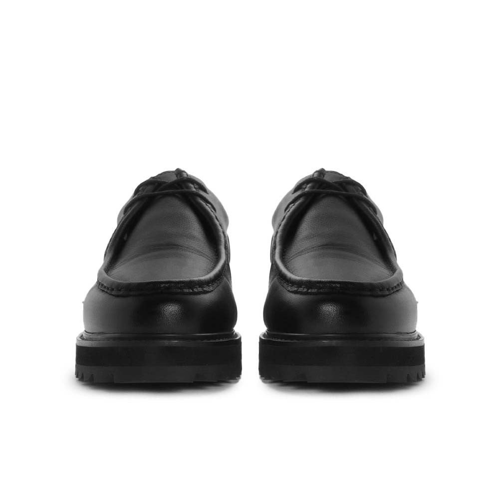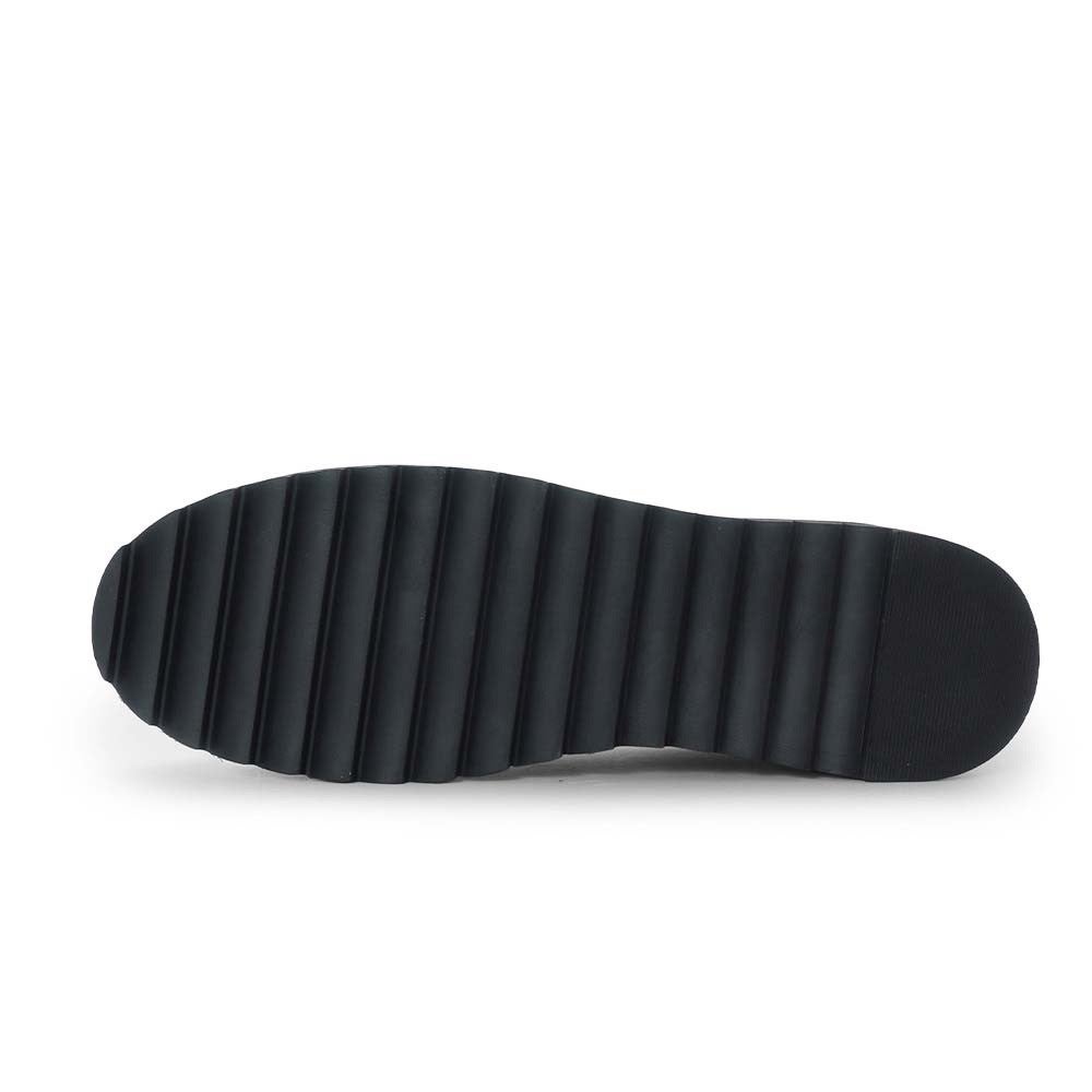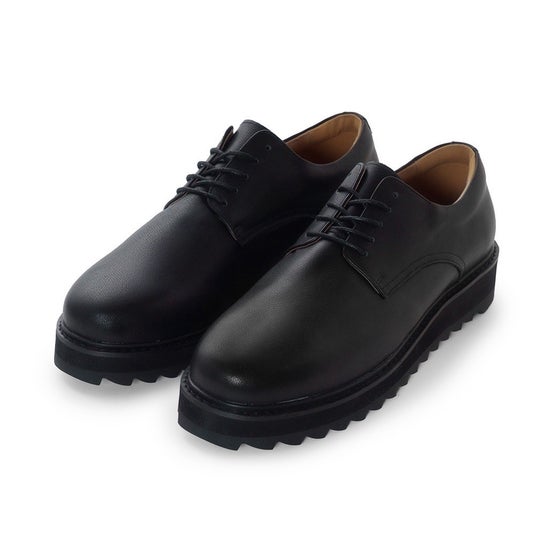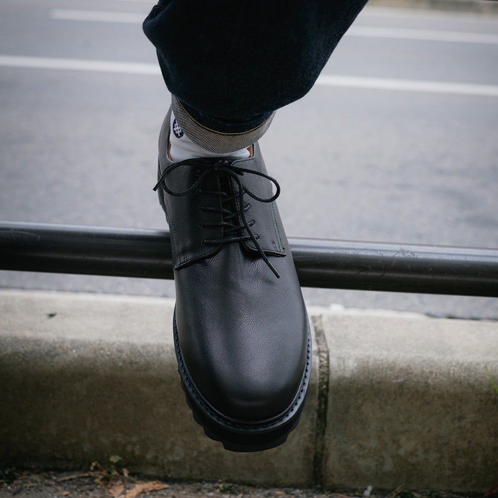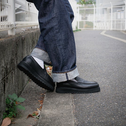 これをあえて革靴に落とし込むことで、濡れた舗道、ケーブルだらけのスタジオ床、金属階段等で安定したグリップを確保します。