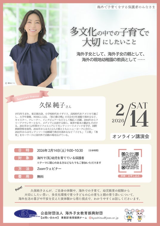 公益財団法人 海外子女教育振興財団は、海外で子育てを経験され、現在はアメリカの現地幼稚園で教員をされている元NHKアナウンサーの久保純子さんをスピーカーにお迎えし、オンライン無料講演を開催します。