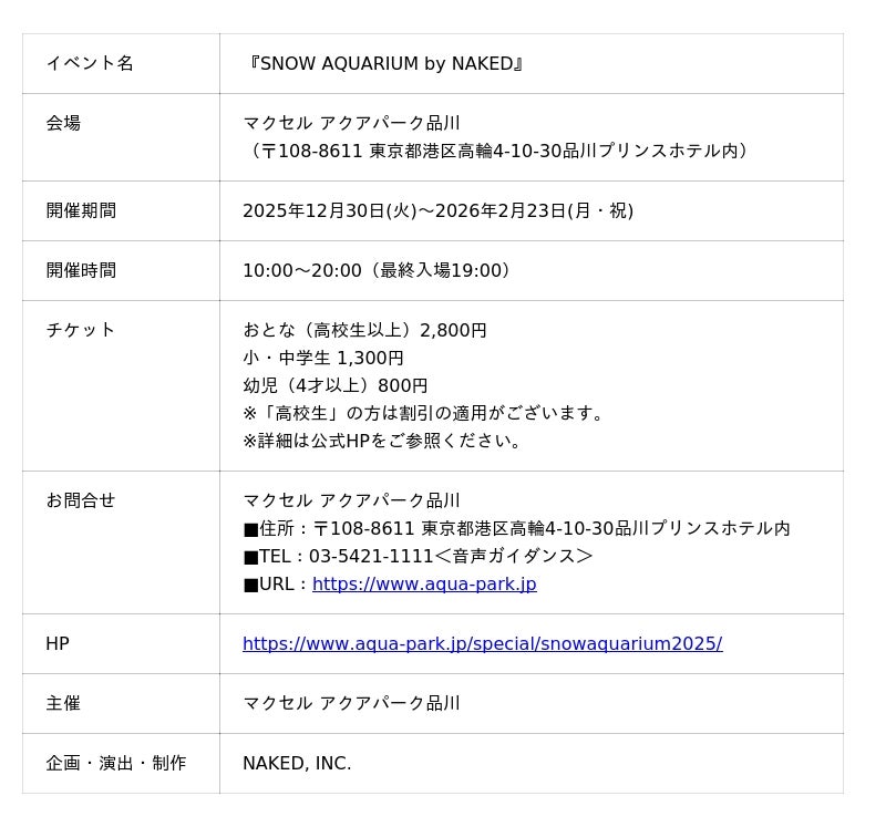 株式会社ネイキッド(英語表記:NAKED, INC. 所在地:東京都渋谷区、代表:村松亮太郎)は、マクセル アクアパーク品川にて、2025年12月30日(火)から2026年2月23日(月・祝)まで冬季限定イベント『SNOW AQUARIUM by NAKED』の企画・演出・制作を手がけます。