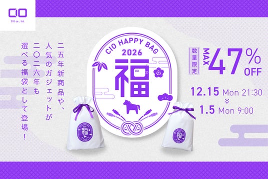 株式会社CIO(本社:大阪府守口市、代表取締役社長:中橋 翔大)は、2025年12月15日(月)21:30~ 2026年1月5日(月)09:00までの期間、「CIO 人気ガジェットが選べる福袋2026」をCIO公式サイト、CIO楽天市場店にて販売します。また、ルクア イーレ 9階 梅田 蔦屋書店内のCIO STOREにて2026年1月2日(金)~1月4日(日)にて販売します。