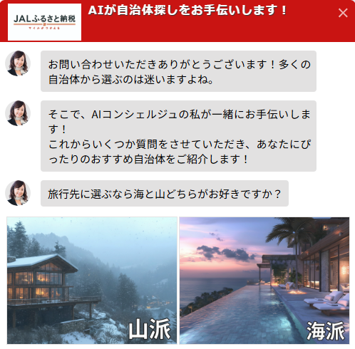 株式会社JALUX(本社:東京都港区、代表取締役社長:河西 敏章、以下「JALUX」)と株式会社ジーニー(本社:東京都新宿区、代表取締役社長:工藤 智昭、以下「ジーニー」)は、JALUXが運営する「JALふるさと納税」のサービス開始5周年を記念し、返礼品選びをより発見的で楽しい体験へと進化させる新たな取り組みとして、「AI返礼品診断」 を導入しました。