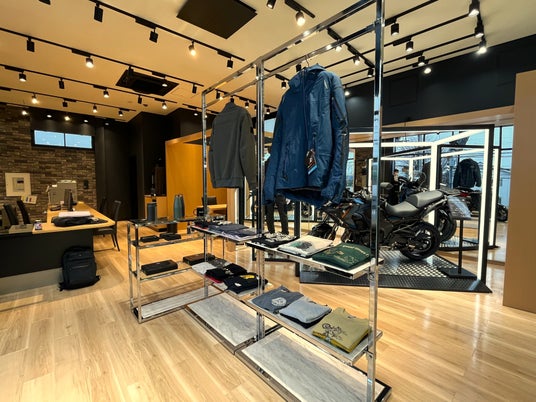 木目調のフロアと白い天井が織りなす明るい店内。モーターサイクルとプラザアパレルがゆったりと展示され、どなたでも楽しめる空間となっています。