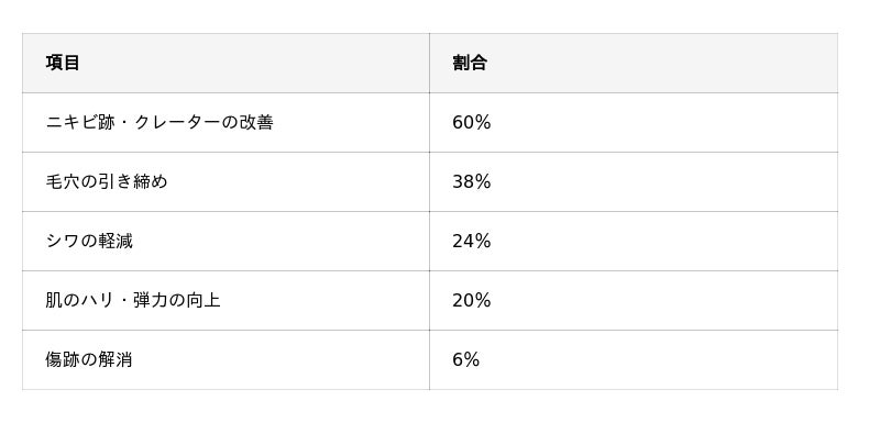 トライフィルプロの施術効果として、「ニキビ跡・クレーターの改善」を実感したと回答した方は全体の60%にのぼりました。