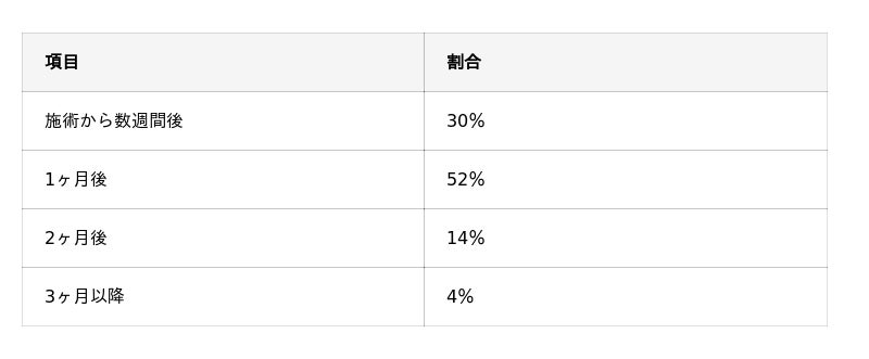 - 施術後、「1ヶ月後」に効果を感じ始めたと答えた人は52%で最多。