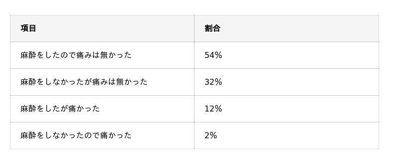 - 施術中の痛みに関して、「痛みは無かった」と答えた人は合わせて86%に達した。