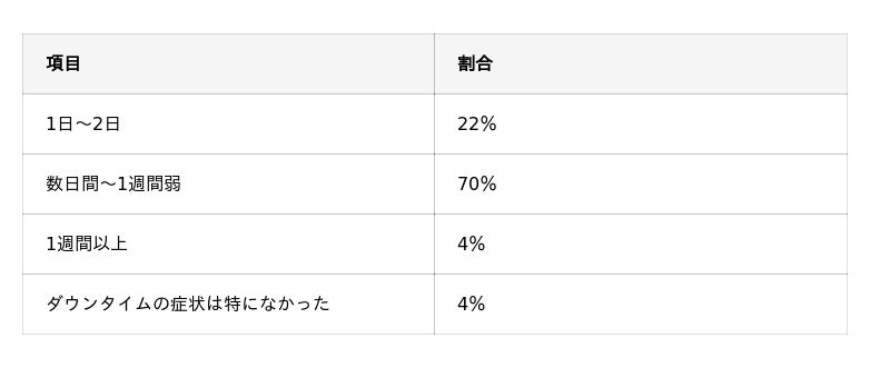 施術後のダウンタイムについては、「数日~1週間弱」と回答した方が全体の7割という結果でした。