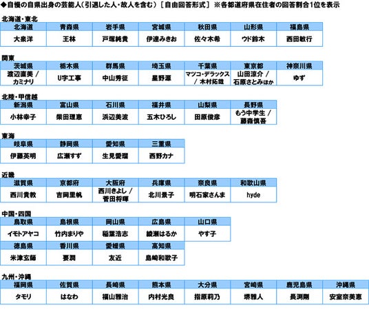 ◆自慢の自県出身の芸能人 岩手県「戸塚純貴さん」、山形県「ウド鈴木さん」、福島県「西田敏行さん」、茨城県「渡辺直美さん/カミナリ」、埼玉県「星野源さん」、新潟県「小林幸子さん」、福井県「五木ひろしさん」、愛知県「生見愛瑠さん」、三重県「西野カナさん」、京都府「吉岡里帆さん」、和歌山県「hydeさん」、島根県「竹内まりやさん」、岡山県「稲葉浩志さん」、福岡県「タモリさん」、宮崎県「堺雅人さん」