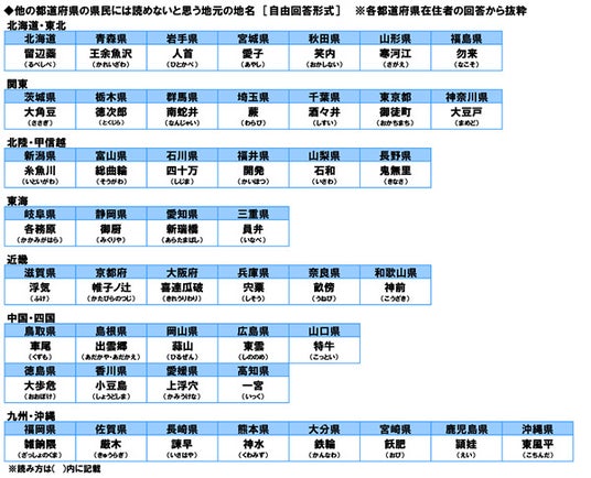 ◆他の都道府県の県民には読めないと思う地元の地名 北海道「留辺蘂」、青森県「王余魚沢」、群馬県「南蛇井」、東京都「御徒町」、神奈川県「大豆戸」、富山県「総曲輪」、石川県「四十万」、愛知県「新瑞橋」、三重県「員弁」、滋賀県「浮気」、鳥取県「車尾」、島根県「出雲郷」、岡山県「蒜山」、徳島県「大歩危」、愛媛県「上浮穴」、大分県「鉄輪」、宮崎県「飫肥」、鹿児島県「頴娃」、沖縄県「東風平」