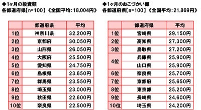 投資額についてみると、1ヶ月の投資額の平均は、1位「神奈川県」(32,200円)、2位「京都府」(30,050円)、3位「山形県」(26,050円)となりました。(図30)