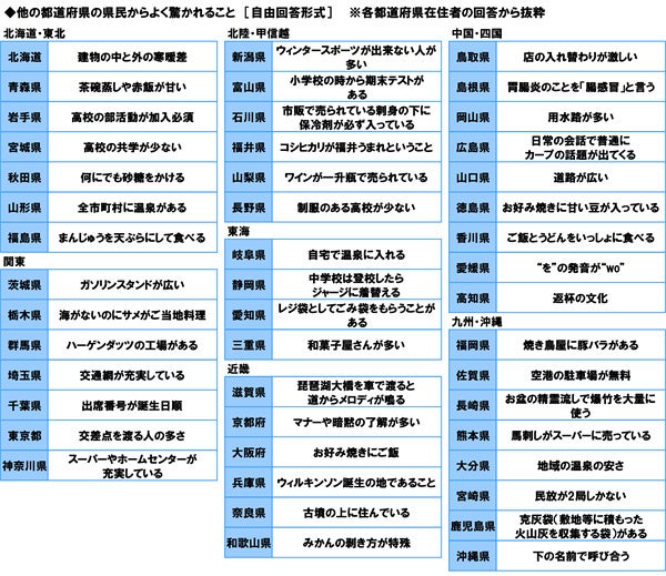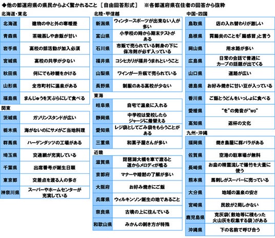 ◆他の都道府県の県民からよく驚かれること 岩手県「高校の部活動が加入必須」、山形県「全市町村に温泉がある」、栃木県「海がないのにサメがご当地料理」、新潟県「ウィンタースポーツが出来ない人が多い」、山梨県「ワインが一升瓶で売られている」、奈良県「古墳の上に住んでいる」、鳥取県「店の入れ替わりが激しい」、高知県「返杯の文化」、長崎県「お盆の精霊流しで爆竹を大量に使う」、沖縄県「下の名前で呼び合う」