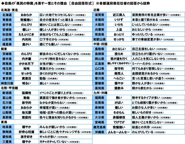 ◆自県の“県民の特徴”を表す一言 秋田県「ええふりこき」、群馬県「かかあ天下」、山梨県「地元愛」、愛知県「派手好き」、大阪府「いらち」、岡山県「我が道を行く」、広島県「熱しやすく冷めやすい」、香川県「へらこい」、高知県「酒飲み」、福岡県「熱い」、熊本県「わさもん」、沖縄県「よんなーよんなー」