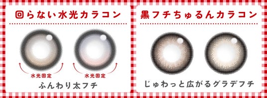 「Candy Veil(キャンディベール)」と「Chuchu Cherry(チュチュチェリー)」の2色は「回らない水光カラコン」となっており、ハイライトが可愛く見える位置をキープします。
