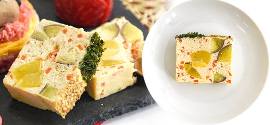 お正月の縁起物「松風焼き」をモチーフに白ゴマとあおさの2色を表面にあしらった和風テリーヌです。ほくほくとした甘みのあるさつまいもと、香り豊かな栗をたっぷり使用し、旬の恵みをぎゅっと詰め込みました。チキンもふんだんに使い、素材の旨みを引き立てる上品な味わいに仕上げました。「松風焼き」は雨風に耐え、長寿の象徴とされる松の木にちなんだと言われています。お正月やお祝いの席にふさわしい華やかな和のテリーヌです。(サイズ:縦約2cm×幅約5cm、高さ約4.5cm、価格:990円(税込)、原産国名:日本)