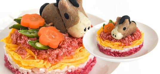 2026年の干支「馬」をじゃがいも、白餡、黒ゴマあしらって飾りつけた押し寿司です。1層目と2層目のご飯は、おめでたい新年にふさわしい紅白色にし、素敵な一年になるよう想いを込めて作りました。(サイズ:直径約7.5cm×高さ5.5cm、価格:1,100円(税込)、原産国名:日本)