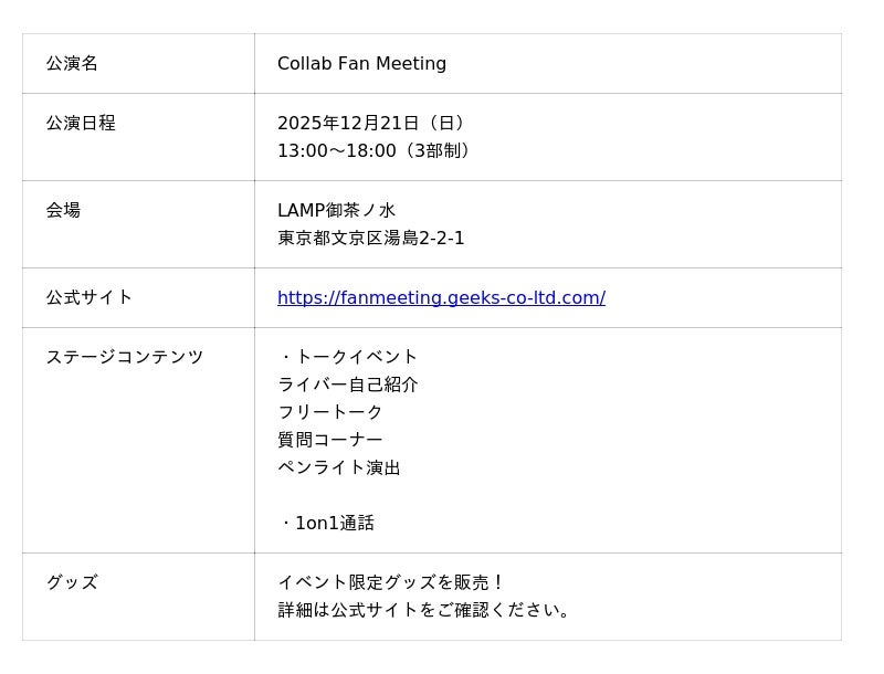 Vライバーエージェンシー『LOViT STUDIO』(運営:株式会社HIKE、以下「ラビスタ」)は、2025年12月21日(日)にLAMP御茶ノ水にて開催される「Collab Fan Meeting」に、ラビスタ所属のVライバー5名が参加いたします。本イベントはVライブコミュニケーションアプリ「IRIAM」で活動する10事務所による合同イベントです。ラビスタからは宇兎いち、竹花文明、十六夜てん、もちっ兎ねむる、幽田ねおが参加します。現在、イベントチケットを好評販売中です。