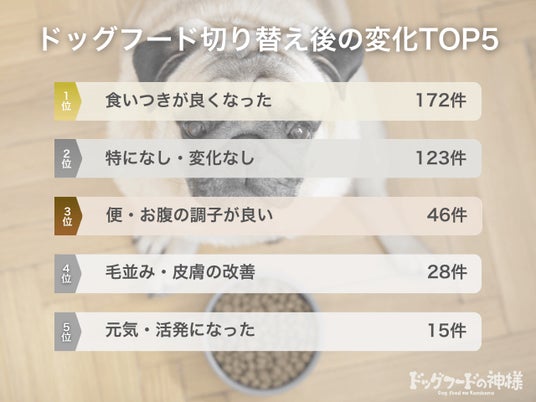- 変化の1位は「食いつき改善」が約半数。体調面では「うんち」の状態を健康のバロメーターにする人が多かった。