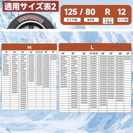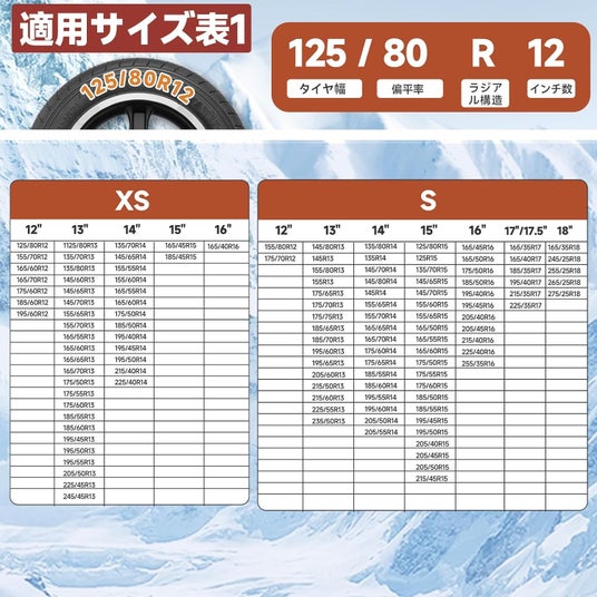 主要なタイヤサイズに対応した6種類のサイズをご用意。ほとんどの乗用車に対応可能です(ご購入前には、必ずお車のタイヤサイズと製品適合表をご確認ください)。