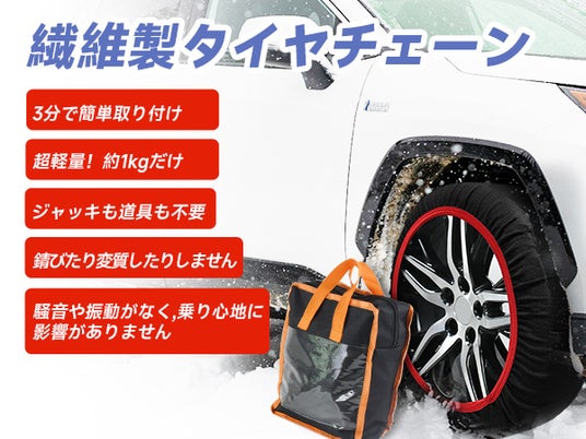突然の積雪や凍結路でも、慌てず安心。面倒なジャッキアップは不要で、わずか3分で装着完了。金属チェーンに代わる、静かでタイヤを守る画期的な布製タイヤチェーンです。