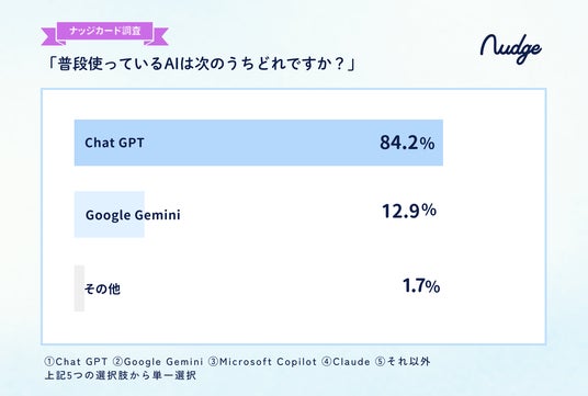 「普段使っているAIは次のうちどれですか?」という質問に対しては、「ChatGPT」が84.2%と圧倒的多数を占め、他のAIサービスとの差が大きい結果となりました。
