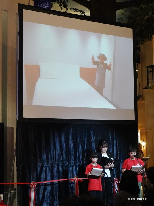 セレモニーは、キッザニア甲子園のこども議会議員が中心となり進行しました。中継カメラに映し出された「ホテル」パビリオンの映像には、「ホテリエ」のユニフォームを着用した瀧澤氏とこどもが登場し、フロントでの「おかえりなさいませ」の挨拶をした後、「ホテリエ」のユニフォームと体験内容を紹介。続いて、客室に進み、「メイクスタッフ」のユニフォームや体験内容を紹介しました。