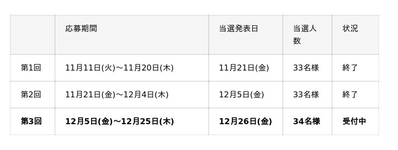 抽選は全3回実施し、いよいよ第3回がラストチャンス!(応募は12月25日まで)