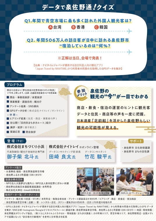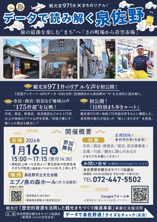 観光客971件と地域175件の声をもとに泉佐野の“いま”を可視化。多角的データ分析で導いた新たな目的別まち歩きルートを初公開する地域報告会を1月16日に開催。地域主体の観光づくりの成果を共有します。