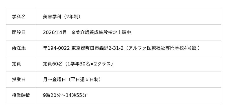 アルファ医療福祉専門学校(東京都町田市)は、2026年4月に新たに「美容学科」を開設申請中。最新の美容サロン実習室をはじめ、先進的な教育環境を整備し、“新しい時代に求められる美容師”の育成を目指します