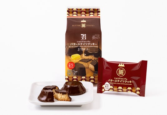 『セブンカフェ なだれとろけ製法 バターステイツクッキー』は、「銀のぶどう」がプロデュースするバタースイーツ専門店「バターステイツ」の人気商品であるバタークッキーを、食べきりやすい個包装にしたオリジナル商品です。たっぷりのバターを練り込んだ生地を焼く“バターなだれとろけ製法”により、バターがとろけて独特な形のクッキーが出来上がります。バターの濃厚な味わいと香ばしさが楽しめる、バター好きにはたまらない逸品。そんな「バターステイツクッキー」が、冬だけの限定“ショコラフォンデュ”になって登場します!