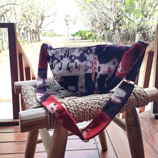 伝統工芸のスンバ織りを使用生徒さん自身が作ったスンバ織りを使ってバッグを作っています。他にヘアバンドなどもありますので、ぜひ会場にお越しいただき商品をご覧ください。