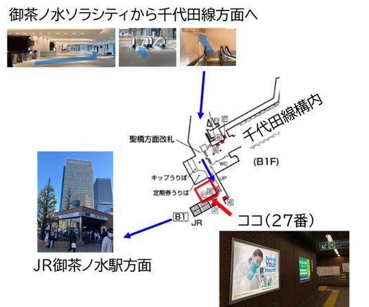 千代田線 新御茶ノ水駅コンコース(JR御茶ノ水駅方面)は、通勤通学で利用する人が多く、当社の所在する御茶ノ水ソラシティからも直結しています。