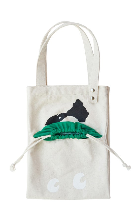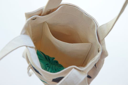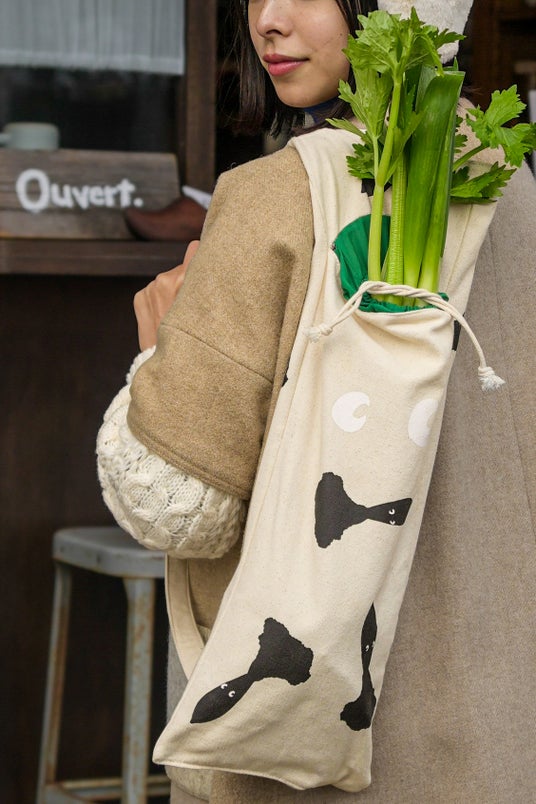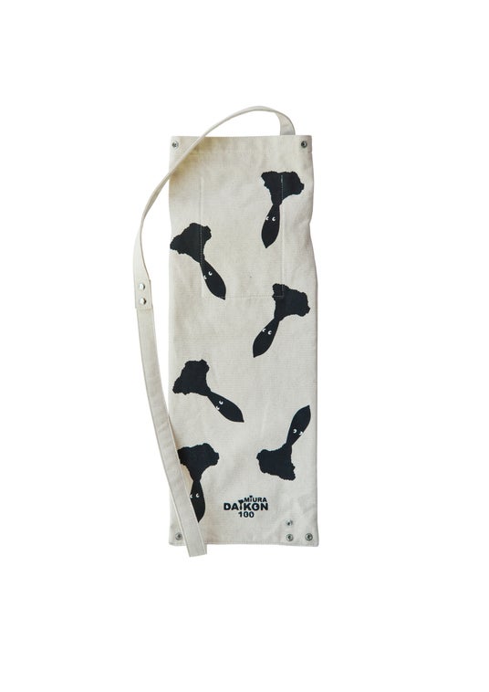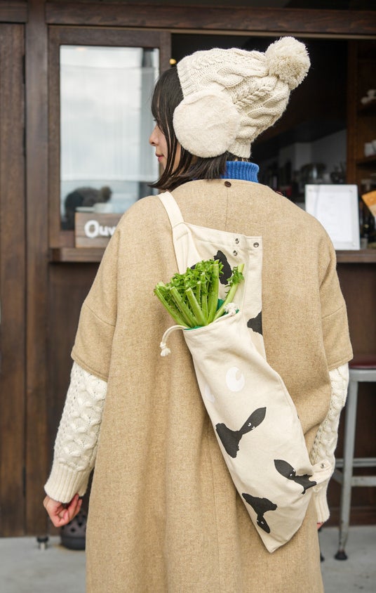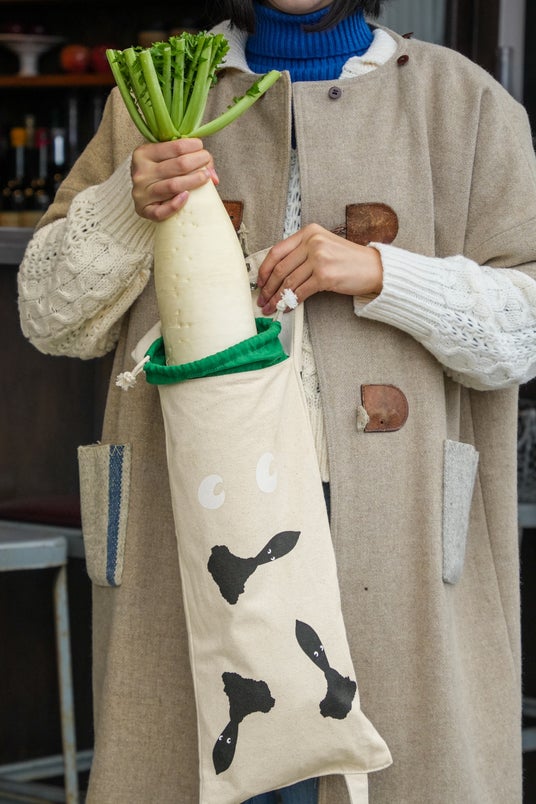 「三浦大根を運ぶ時以外も、毎日の暮らしの中で楽しんでほしい」という高島さんのアイデアで、折りたたんでスナップボタンを留めると、可愛い大根モチーフのミニトートに変身します。