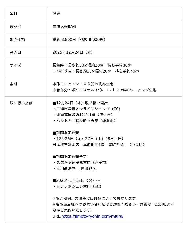 この度、2025年に命名100周年を迎える伝統野菜「三浦大根」をテーマに「三浦大根命名100周年プロジェクト」を立ち上げ、その歴史にはじまり、伝統野菜を継承する作り手の方々、守る送り手の人々を取材するとともに、ファッションデザイナーの高島一精さんを迎えて農地を巡り、そこで得たインスピレーションを元に、唯一無二の三浦大根バッグを制作しました。