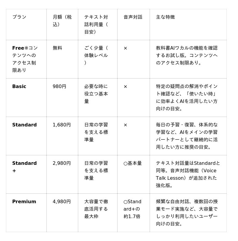 ・Standard+および Premiumプランでご利用いただける「音声対話(Voice Talk Lesson)」の利用量(基本量またはその約1.7倍)は、プランによって異なります。利用量は、付与日から60日間有効です。