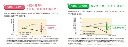 HMPAは、脂肪や糖を消費する代謝スイッチを活性化することにより、BMIが高めの方のお腹の脂肪(内臓脂肪)とウエスト周囲径を減らす機能、LDLコレステロールが高めの方のLDLコレステロールや総コレステロールを下げる機能、食後血糖値が高めの方の食後に上昇した血糖値を下げる機能が報告されています。