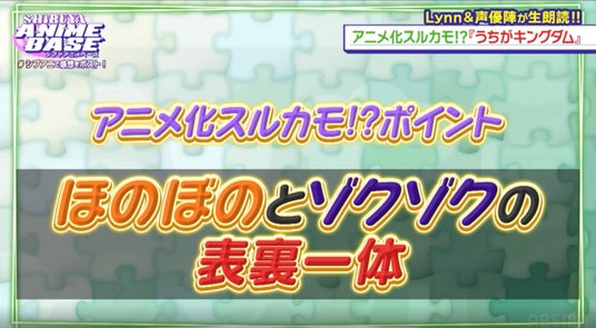 さらに、「アニメ化するカモ!?トピックス」のコーナーでは、新感覚ヒューマンドラマ『うちがキングダム』をピックアップ。『シブアニ』的“アニメ化するかもポイント”として、「ほのぼのとゾクゾクの表裏一体」を挙げ、穏やかな空気の中に突如現れる不穏な描写を、Lynn、仲村宗悟、徳井青空の生朗読で紹介しました。