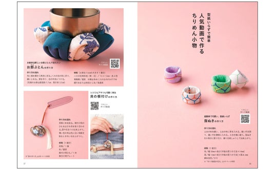人気作品には、作り方動画を二次元コード付きで掲載しています。身近な材料で、ブローチやヘアアクセサリー、お守り袋など、素敵な小物を手作りできます。お友達やお孫さんへの贈り物にされる方も多いのです。伝承のデザインに発想を得た、最新作まで、バラティ豊かな作品が満載です。