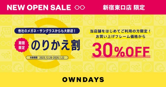 2025年12月26日(金)から2026年1月22日(木)までの期間、OWNDAYS 新宿東口店を初めてご利用いただくお客様を対象に、フレームが30%OFFとなる「のりかえ割」を実施いたします(※4)。他社ブランドのアイウェアをご愛用中の方に加え、過去に他のOWNDAYS店舗をご利用されたことがある方も、新宿東口店が初めてであればご利用可能です。この機会に、快適でスタイリッシュなアイウェアライフをご体験ください。