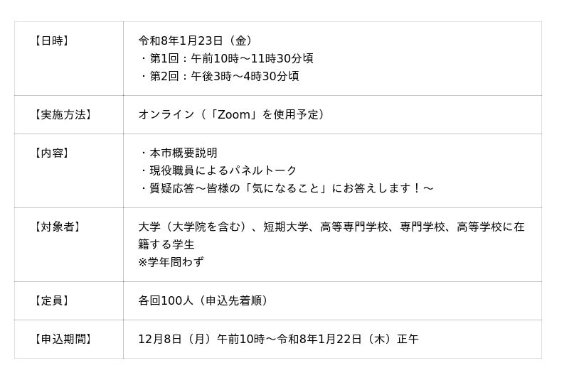 小田原市では、学生の皆様の職業意識向上や、市政に対する理解を深めてもらうことを目的として、オンライン・オープンカンパニーを実施します。