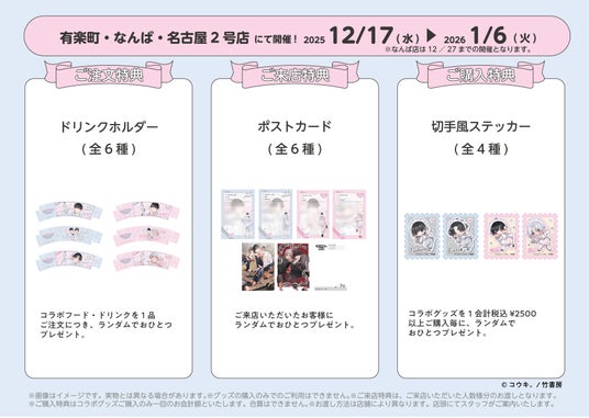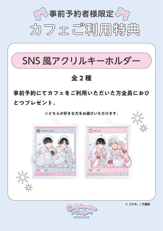 『制服、深夜2時。』『I(ハート)歌舞伎町』コラボメニュー1品のご注文につき、ドリンクホルダー(全6種)をランダムで1枚プレゼント。関連グッズをご購入2,500円(税込)ごとに切手風ステッカー(全4種)をランダムで1枚プレゼント。ご来店いただいたお客様にポストカード(全6種)をランダムで1枚プレゼント。事前予約にてカフェをご利用いただいたお客様にSNS風アクリルキーホルダー(全2種)全員におひとつプレゼント。※どちらか好きな方をお選びいただけます。