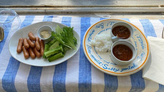 Curry2種とごはん。ソーセージ+きゅうり+フリルレタス。