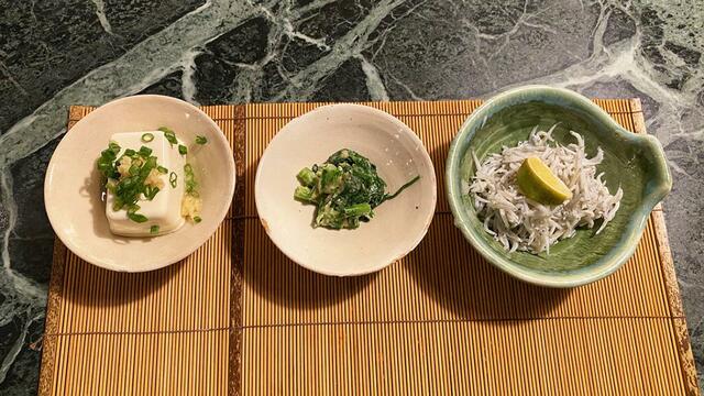 絹豆腐、春菊の胡麻和え、シラスおろし。