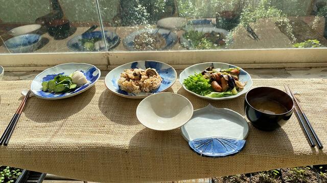 栗ごはん、椎茸の味噌汁。食材不足。タンパク質が足りないね。