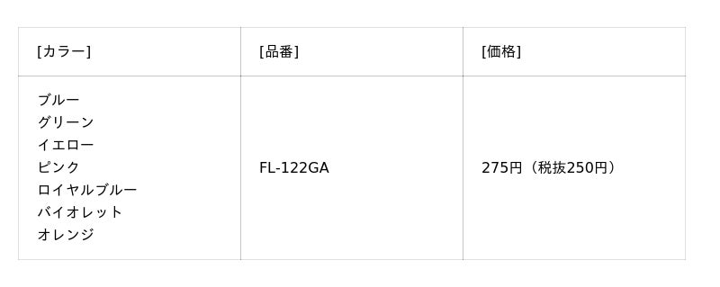 カラーはブルー、グリーン、イエロー、ピンク、ロイヤルブルー、バイオレット、オレンジの全7色。メーカー希望小売価格(税込)は275円です。