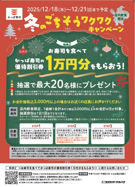 ・内容:店内飲食限定で1組様1会計あたり税込3,000円以上のお会計の方を対象に、抽選で最大20名様に1万円分のかっぱ寿司の優待割引券をプレゼント
