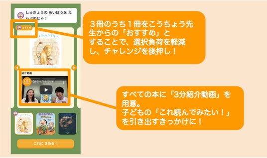 また、すべての本には内容を約3分でまとめた紹介動画を用意しており、自ら「これを読みたい!」という気持ちから読書をスタートできるよう設計されています。