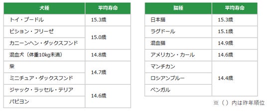 犬・猫の平均寿命を調査したところ、犬は14.1歳、猫は14.5歳でした。犬種別・猫種別の平均寿命では、犬は「トイ・プードル」、猫は「日本猫」が、ともに15.3歳で1位となりました。平均寿命が上位の犬種・猫種は以下のとおりです。