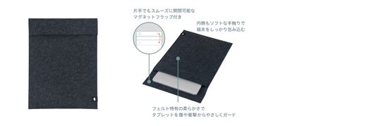 - 片手でもスムーズに開閉可能なマグネットフラップ付きのタブレットスリーブケース- フェルト特有のやわらかさで、タブレットをキズや衝撃からやさしくガード。
