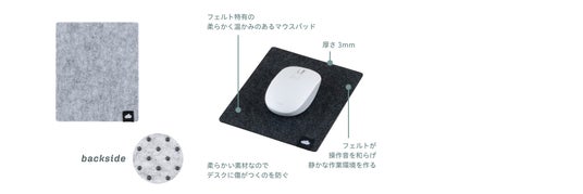 - フェルト特有の柔らかく温かみのあるマウスパッド- フェルトがマウス操作時の音をやわらげ、静かな作業環境を作る